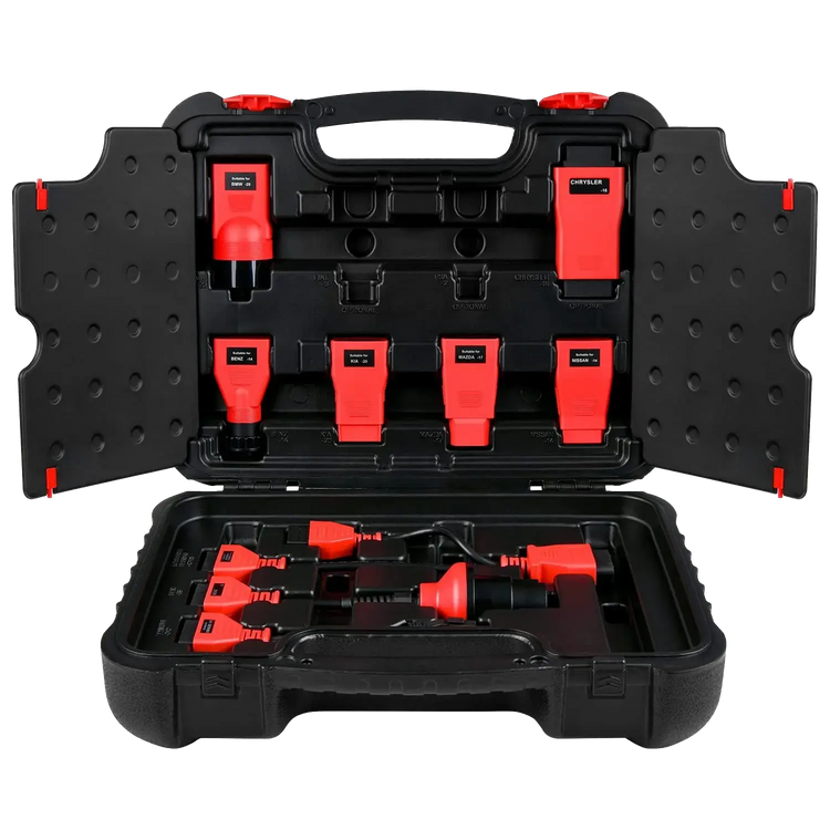 The Autel MaxiSys MSOBD2KIT Non-OBDII Adapter Kit includes OE-compliant adapters for specific vehicles produced between 1996 and 2002 that lack the standard OBD2 pin configuration. It comes with 9 types of dedicated connectors—Nissan-14, Mitsubishi/Hyundai 12+16, Kia-20, BMW-20, Benz-38, VW/Audi-2+2, Mazda-17, Chrysler-16, and Benz-14—all housed in a blow-molded carrying case.